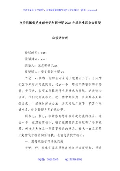 / 市委组织部党支部书记与副书记2024年组织生活会会前谈心谈话材料