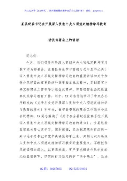 / 某县纪委书记在开展深入贯彻中央八项规定精神学习教育动员部署会上的讲话