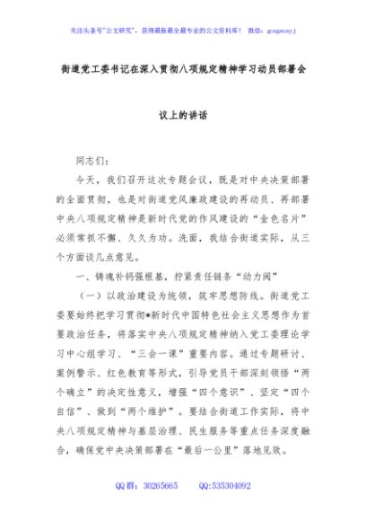 / 街道党工委书记在深入贯彻八项规定精神学习动员部署会议上的讲话