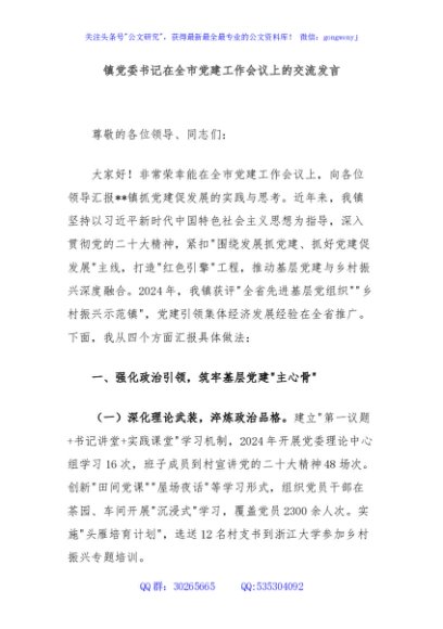 / 镇党委书记在全市党建工作会议上的交流发言