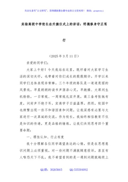 / 实验高级中学校长在升旗仪式上的讲话:明德修身守正笃行