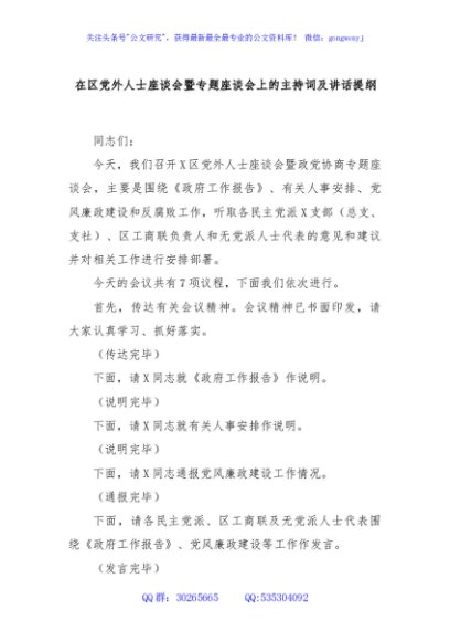 / 在区党外人士座谈会暨专题座谈会上的主持词及讲话提纲