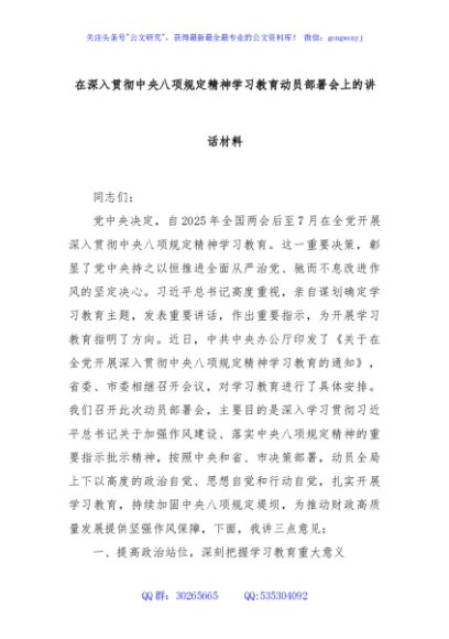 / 在深入贯彻中央八项规定精神学习教育动员部署会上的讲话材料