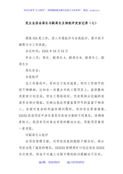 / 民主生活会局长与副局长互相批评发言记录(七)
