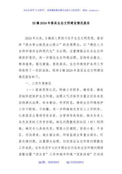 / XX镇2024年落实生态文明建设情况报告