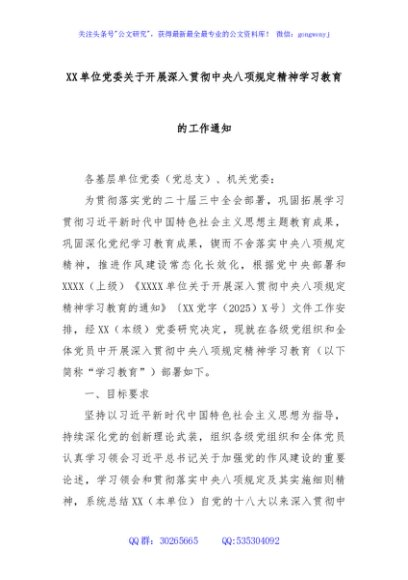 / XX单位党委关于开展深入贯彻中央八项规定精神学习教育的工作通知
