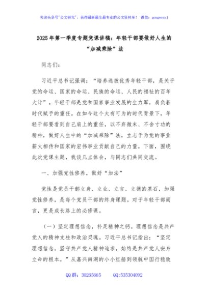 / 2025年第一季度专题党课讲稿:年轻干部要做好人生的“加减乘除”法