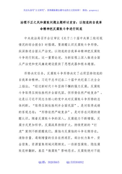 治理不正之风和腐败问题主题研讨发言:以彻底的自我革命精神把反腐败斗争进行到底