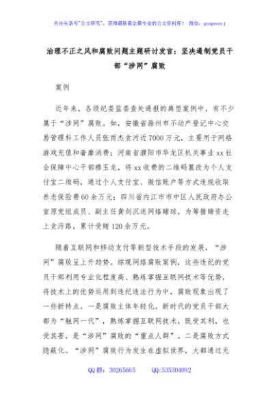 / 治理不正之风和腐败问题主题研讨发言:坚决遏制党员干部“涉网”腐败