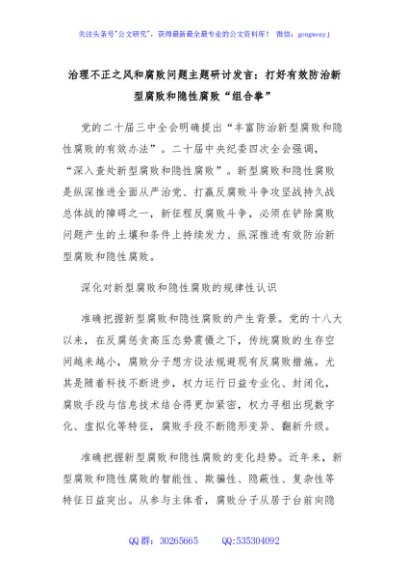 / 治理不正之风和腐败问题主题研讨发言:打好有效防治新型腐败和隐性腐败“组合拳”