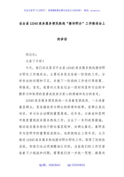 / 在全县12345政务服务便民热线“接诉即办”工作推进会上的讲话
