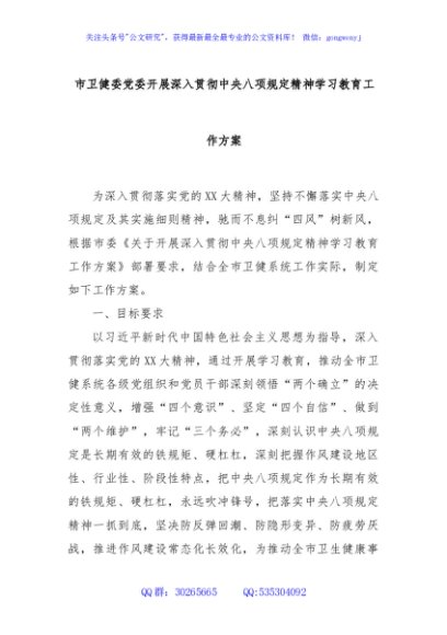 / 市卫健委党委开展深入贯彻中央八项规定精神学习教育工作方案