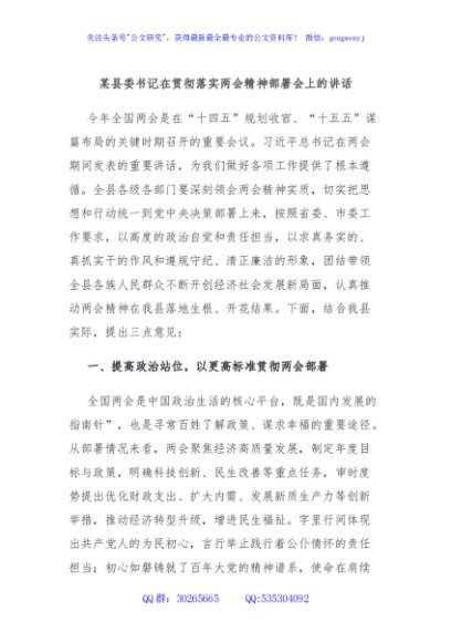 / 某县委书记在贯彻落实两会精神部署会上的讲话