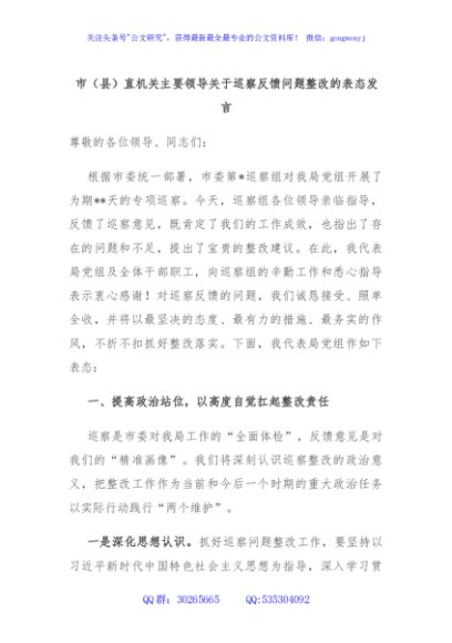 / 市(县)直机关主要领导关于巡察反馈问题整改的表态发言
