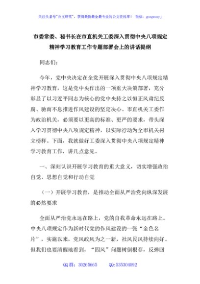 / 市委常委、秘书长在市直机关工委深入贯彻中央八项规定精神学习教育工作专题部署会上的讲话提纲