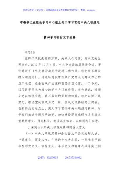 / 市委书记在理论学习中心组上关于学习贯彻中央八项规定精神学习研讨发言材料