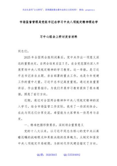 / 市场监督管理局党组书记在学习中央八项规定精神理论学习中心组会上研讨发言材料