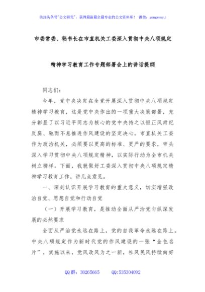 / 市委常委、秘书长在市直机关工委深入贯彻中央八项规定精神学习教育工作专题部署会上的讲话提纲