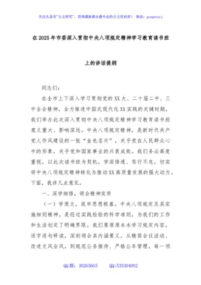 / 在2025年市委深入贯彻中央八项规定精神学习教育读书班上的讲话提纲