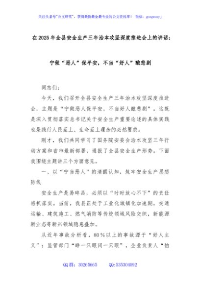 / 在2025年全县安全生产三年治本攻坚深度推进会上的讲话:宁做“恶人”保平安,不当“好人”酿悲剧
