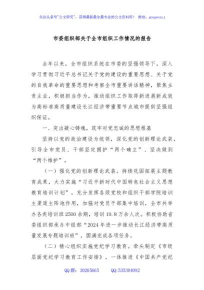 / 市委组织部关于全市组织工作情况的报告