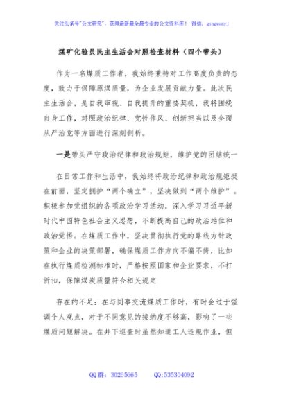 / 煤矿化验员民主生活会对照检查材料(四个带头)