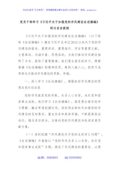 / 党员干部学习《习近平关于加强党的作风建设论述摘编》研讨发言提纲
