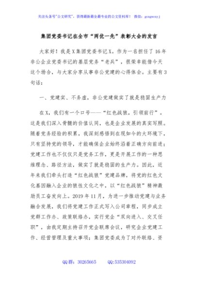/ 集团党委书记在全市“两优一先”表彰大会的发言