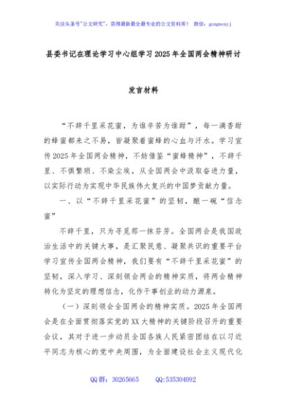 / 县委书记在理论学习中心组学习2025年全国两会精神研讨发言材料