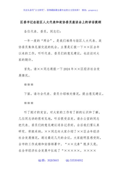 / 区委书记在驻区人大代表和政协委员座谈会上的讲话提纲