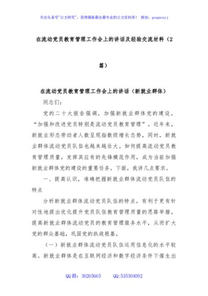 (2篇)在流动党员教育管理工作会上的讲话及经验交流材料