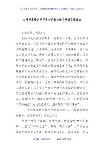 / 八项规定理论学习中心组集体学习研讨交流发言