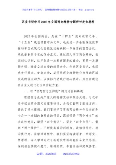 / 区委书记学习2025年全国两会精神专题研讨发言材料
