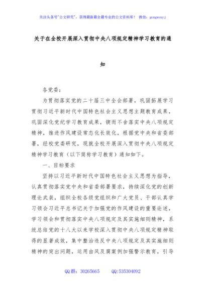 / 关于在全校开展深入贯彻中央八项规定精神学习教育的通知