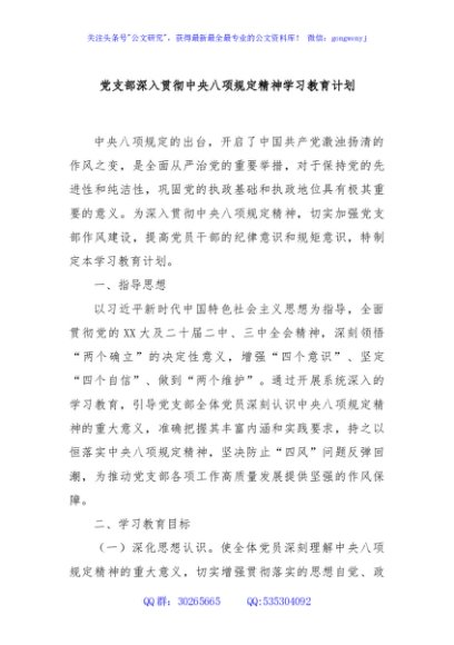 / 党支部深入贯彻中央八项规定精神学习教育计划