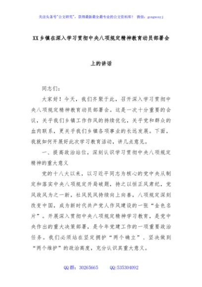 / XX乡镇在深入学习贯彻中央八项规定精神教育动员部署会上的讲话