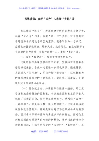 / 党课讲稿:当好“四种”人走好“书记”路