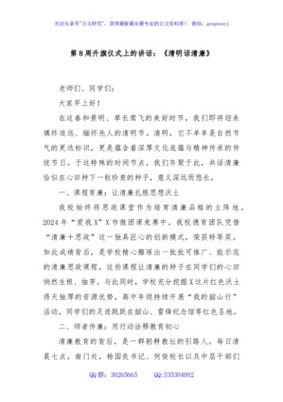 / 第8周升旗仪式上的讲话:《清明话清廉》