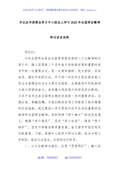 / 书记在市委理论学习中心组会上学习2025年全国两会精神研讨发言材料