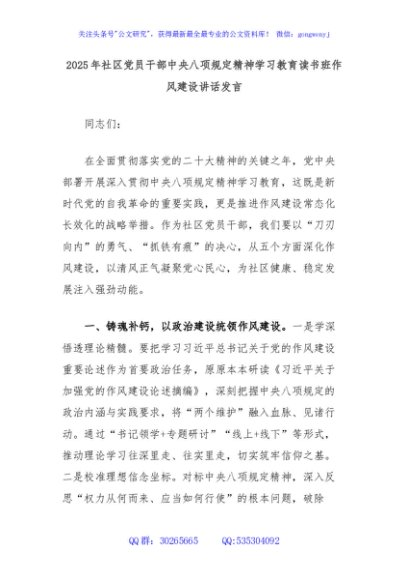 / 2025年社区党员干部中央八项规定精神学习教育读书班作风建设讲话发言