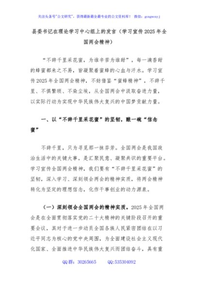 / 县委书记在理论学习中心组上的发言(学习宣传2025年全国两会精神)