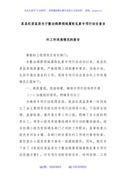 / 某县纪委监委关于整治殡葬领域腐败乱象专项行动自查自纠工作进展情况的报告
