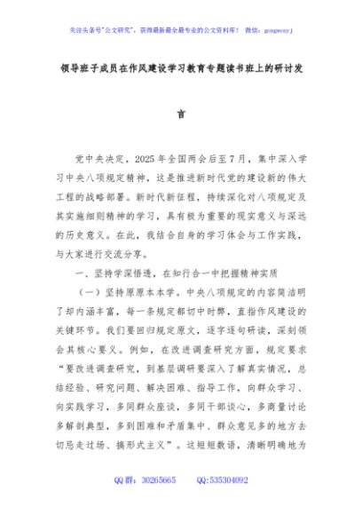 / 领导班子成员在作风建设学习教育专题读书班上的研讨发言