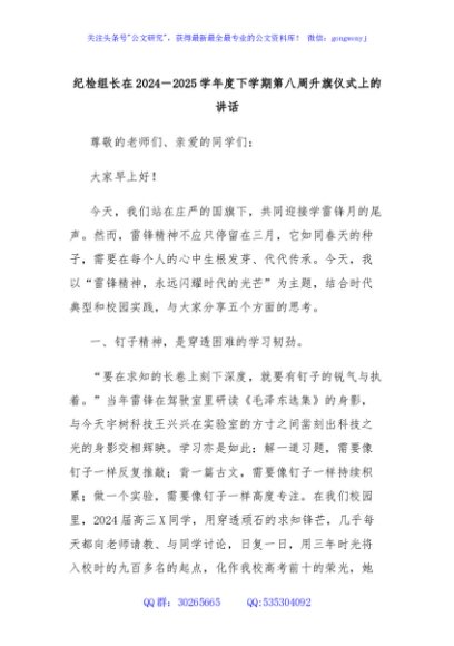 / 纪检组长在2024-2025学年度下学期第八周升旗仪式上的讲话