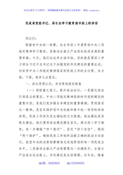 / 民政局党组书记、局长在学习教育读书班上的讲话