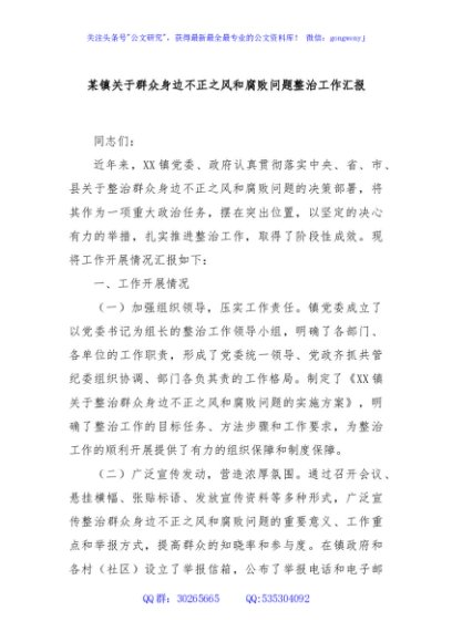 / 某镇关于群众身边不正之风和腐败问题整治工作汇报