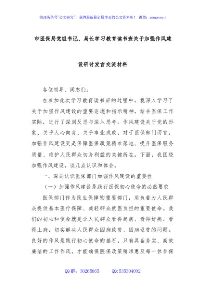 / 市医保局党组书记、局长学习教育读书班关于加强作风建设研讨发言交流材料