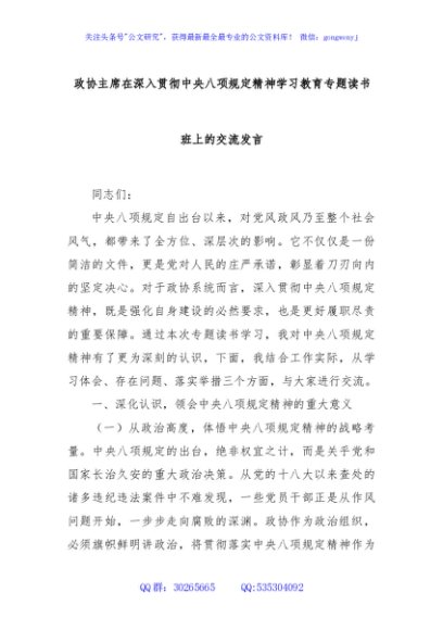 / 政协主席在深入贯彻中央八项规定精神学习教育专题读书班上的交流发言