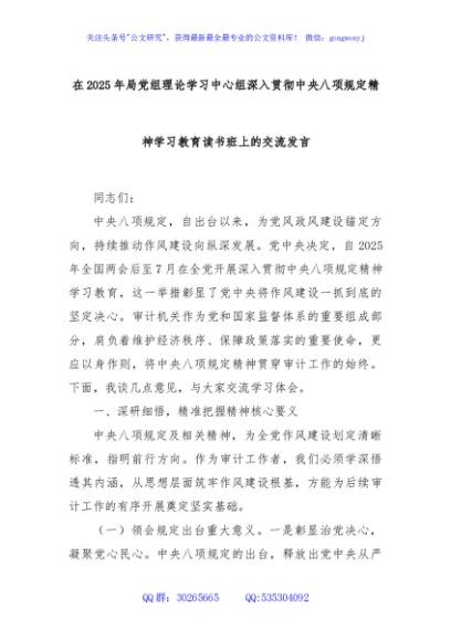 / 在2025年局党组理论学习中心组深入贯彻中央八项规定精神学习教育读书班上的交流发言