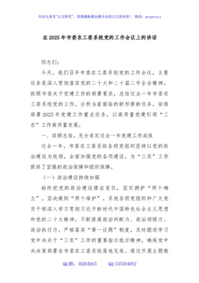 / 在2025年市委农工委系统党的工作会议上的讲话